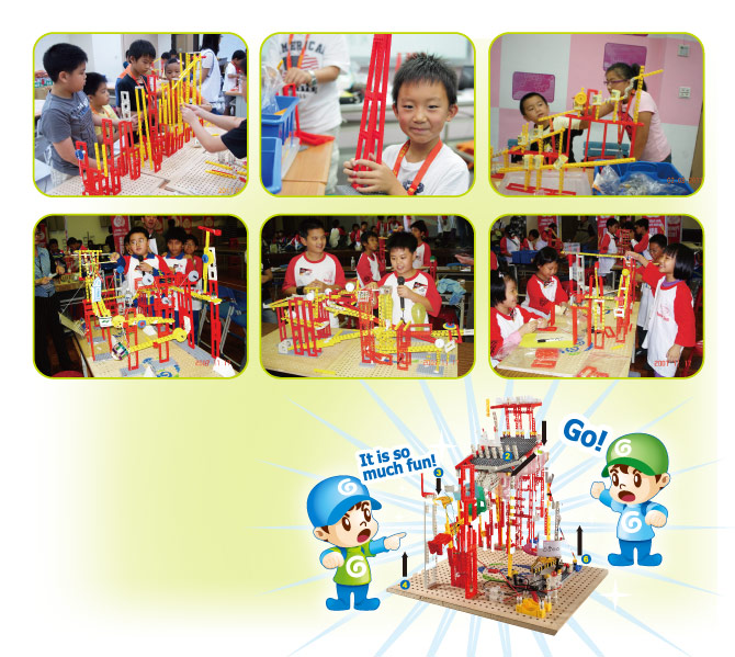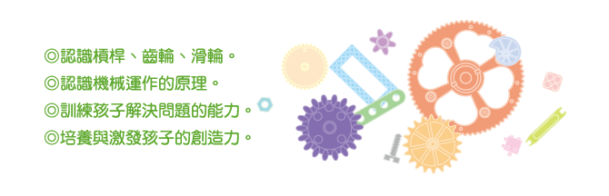 本營隊採用機關王競賽的指定教具,以循序漸進的學習方式,先指導同學們槓桿力學、滑輪組合、齒輪傳動、輪軸功能等物理原理....等,然後將原理以創意思考融入積木中,讓學童盡情發揮巧思,並激發學童機關構造設計的組裝思維,訓練小朋友邏輯飛機及結構的概念。