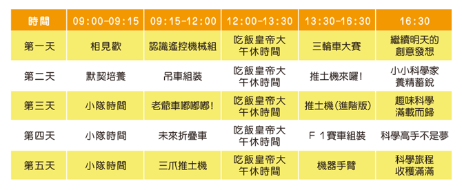 機器人的製作課程與活動,融合了控制、機械、資訊等相關領域,一年一度的機器人大賽,是全台最重要的科學競賽,台灣的選手常常在國際機器人賽事上大放異采,「全國機器人大賽」營隊,藉由智高積木的組裝,帶領學員以觸控式遙控,導入機器人積木的世界,將控制的原理,解析到最基本的元件模式,讓學員熟悉電學、機械、物理等不同的機器人實驗,為學員日後參加全國機器人大賽,打下深厚的基礎。