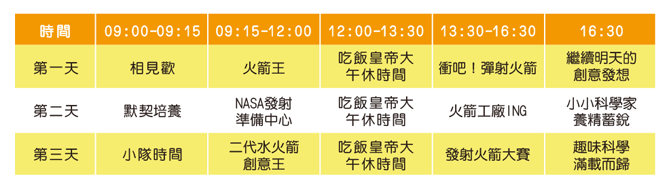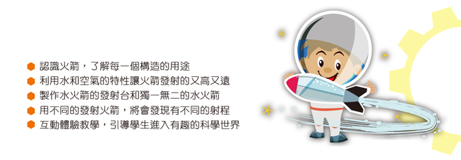 大家都玩過水火箭,但是,你一定沒玩過二代水火箭吧?二代水火箭營隊提供每位學員最新研發兩截式的水火箭,超酷、超炫的水火箭,讓學員體驗火箭的結構與發射原理,最後還會親手製作發射器、發射架,組裝二代水火箭成品還可以帶回家喔!