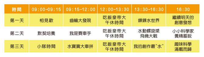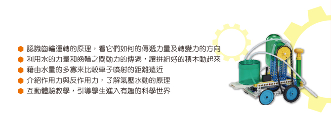 在本營隊中學生會實際操作各式各樣的積木,並且可以用自己做的成品來做實驗,其中可以學習到空氣跟水都是一種物質,佔有空間跟重量,而水與空氣的不同是空氣可以壓縮,壓力越大動力相較增強,而水則可以增加作用力跟反作用力,不僅如此,我們還可以利用水讓車子行走,而水也可以讓發電機轉動而產生電力給人類使用,營隊的最後還可以將『水力發電積木組』帶回家做更多有趣的小遊戲喔!